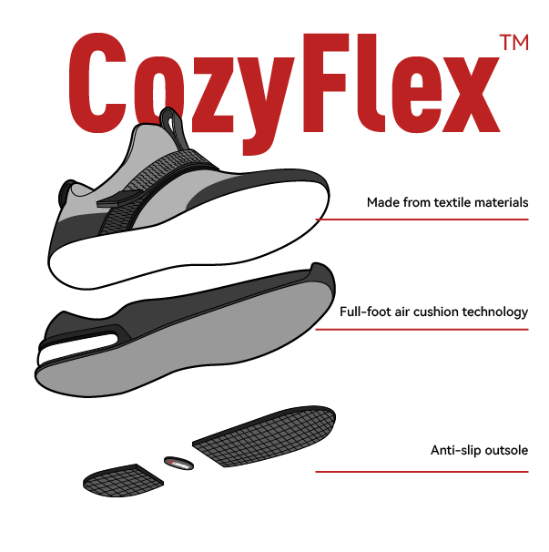 "We aim to provide the most comfortable work shoes for hardworking individuals. 'Cozy Flex' is our exclusive technology, developed in-house, that achieves a seamless integration of the upper, sole, and patch, ensuring a perfect combination."